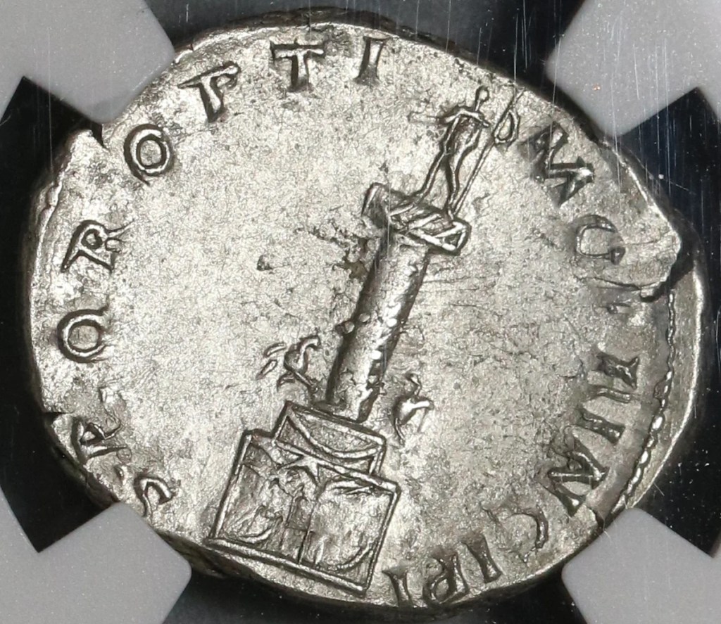 One other variety of Dacia commemorative coins that can be found are coins that portray real life locations or monuments. These variants seem to be somewhat rarer, minted in lower quantities, and generally fetching a higher price. I have only found this type of coin in the form of silver (AR) denarii and various Bronze (AE) coins, but that doesn’t mean that others don’t exist. These coins can portray locations such as “Trajans Column”, the Tropaeum Traiani, and other such landmarks.
