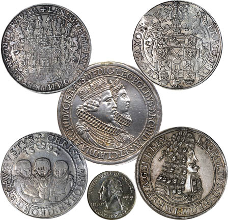 Five different Thaler’s from the renaissance and late medieval period with a US quarter for scale.